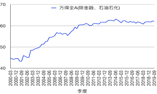 图表13:2002年至2019年3季度万得全A(除金融、石油石化)指数资产负债率(%)