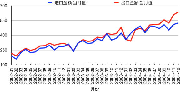 图表15:2002年-2004年月度进出口金额(亿美元)