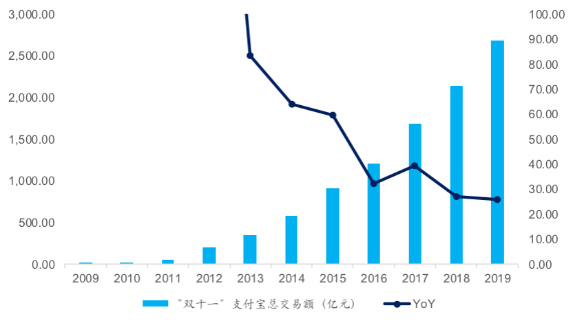 另一方面,中国居民大众消费的能力也不容小觑,电商整体市场在已经如此高的基数之上仍然能够实现20%以上的同比增长,2019年淘宝“双十一”总交易金额仍然能够同比增长25.7%到2684亿元人民币。