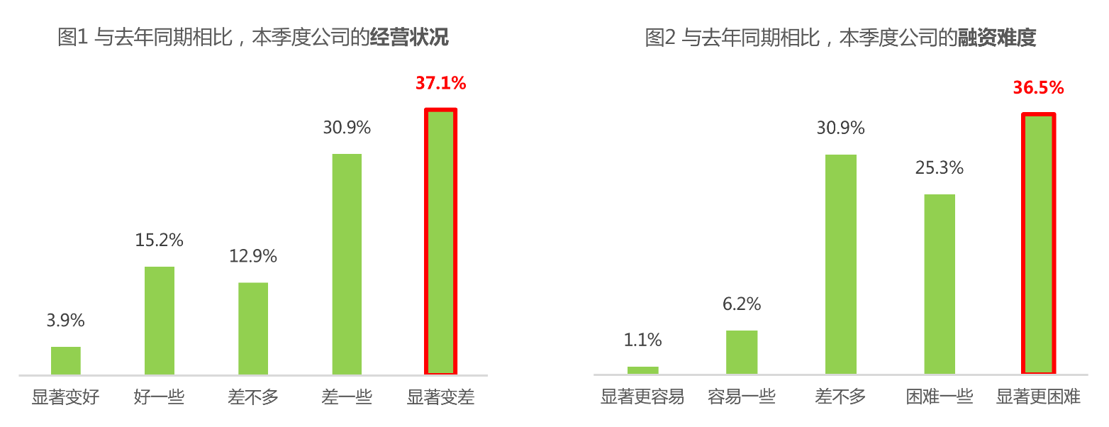 本调查发现,68.0%的创业者认为公司本季度的经营状况将比去年同期更差,其中37.1%的创业者认为公司一季度的经营状况受到严重冲击;仅有3.9%的创业者(文娱及教育行业)报告其经营状况显著变好(图1)。在融资方面,61.8%的创业者认为创业公司的融资变难,其中36.5%认为融资显著更困难(图2);仅有1.1%的创业者(文娱及人工智能行业)认为融资更加容易。如果划分行业来看,融资压力是所有行业面临的普遍问题;除教育行业外,其他行业均面临融资和经营状况下滑的双重挑战;其中,医疗健康、广告营销、生活服务及美业、企业服务、汽车交通及相关服务行业的创业公司的经营状况更加艰难(图3)。
