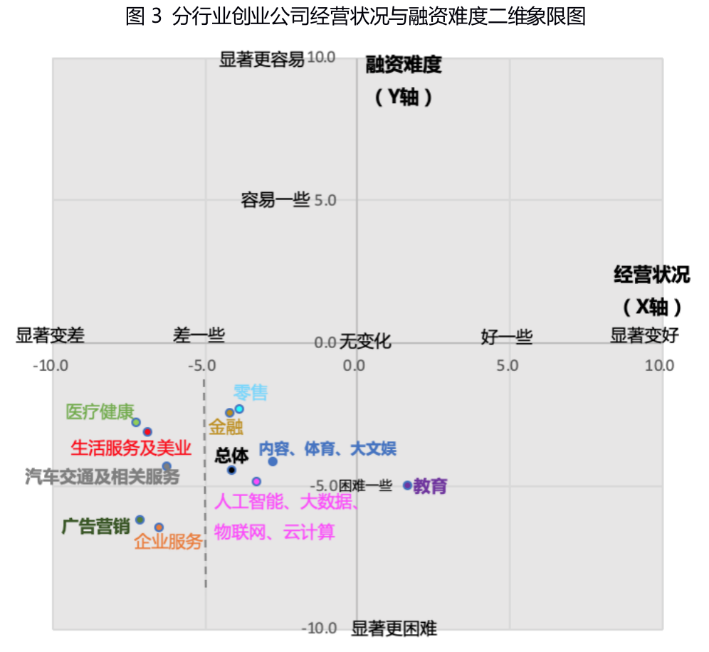 图3 分行业创业公司经营状况与融资难度二维象限图