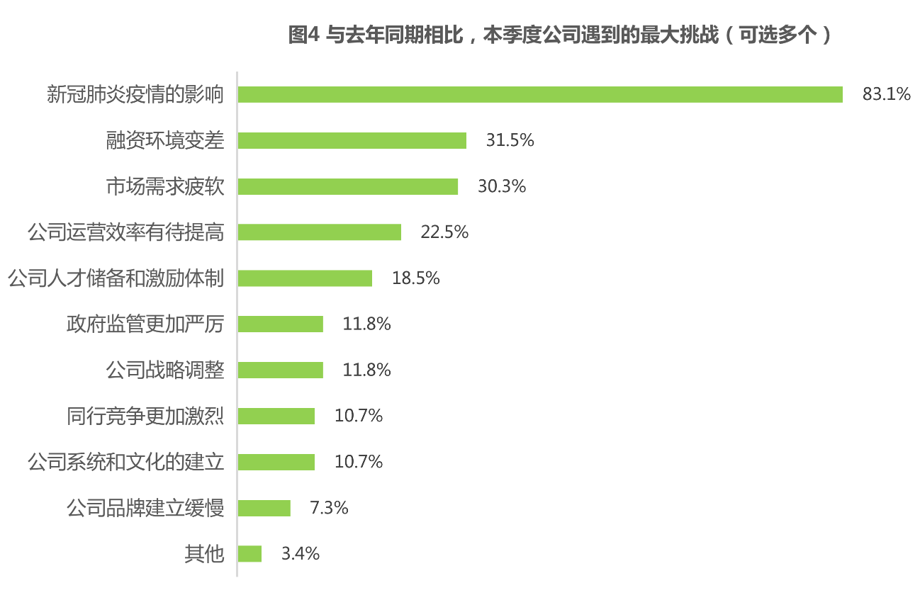 83.1%的受访创业者认为新冠肺炎疫情的影响是本季度面临的最大挑战(图4)。为防控疫情,大面积生产经营活动停滞,整体经济下行也给创业企业带来了融资环境变差和市场需求疲软的双重压力(与去年同期相比,31.5%的创业者认为本季度融资环境变差,30.3%的创业者认为本季度市场需求疲软)。划分行业来看,文娱体育和医疗健康行业虽然相对不受市场需求疲软的不利影响,但均存在着运营效率不高的问题。经营状况因疫情出现利好机遇的互联网教育行业则面临同行竞争激烈的追逐战(表1)。