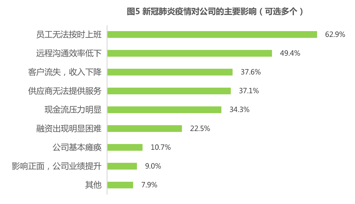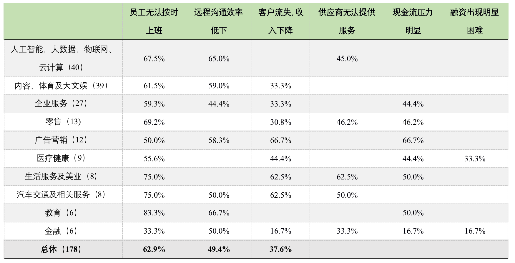 在问到新冠肺炎疫情对公司的影响时(图5),员工无法按时上班(62.9%)、远程沟通效率低下(49.4%)和客户流失、收入下降(37.6%)是参与本次调查的创业者认为的主要影响。值得关注的是,10.7%的受访创业公司基本瘫痪,主要分布在生活服务及美业;9.0%的创业公司则受疫情影响正面、业绩上升,主要分布在教育和娱乐行业。进一步分析发现,生活服务及美业、汽车交通相关服务、零售、人工智能等行业还受到供应商无法提供服务的严重影响;广告营销、生活服务及美业、零售、企业服务、医疗健康行业均出现了明显的现金流压力,即便是经营状况利好的教育行业也存在现金流问题(表2)。