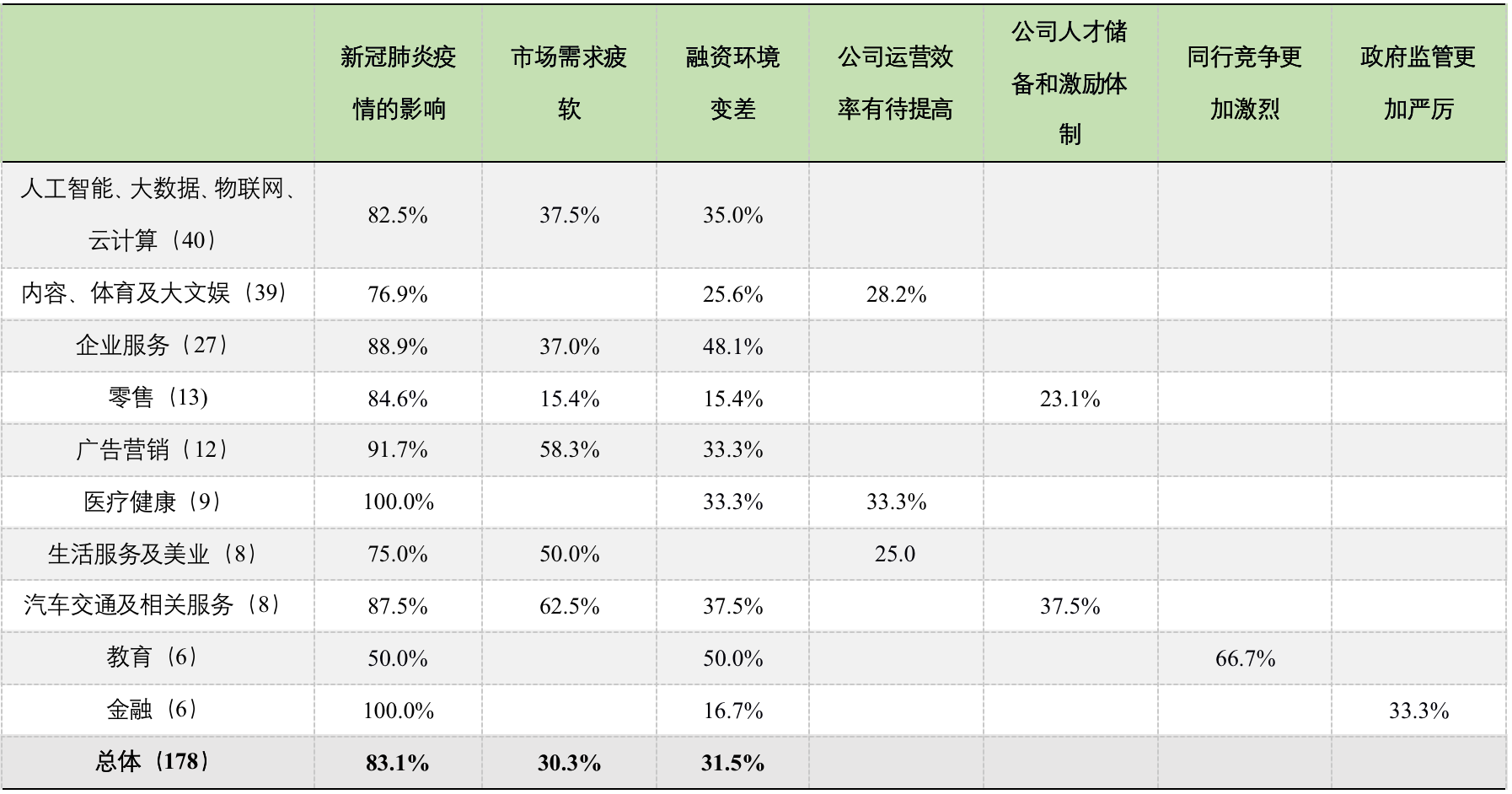 表1 分行业创业公司面临的三大挑战(数值为公司数量占比)