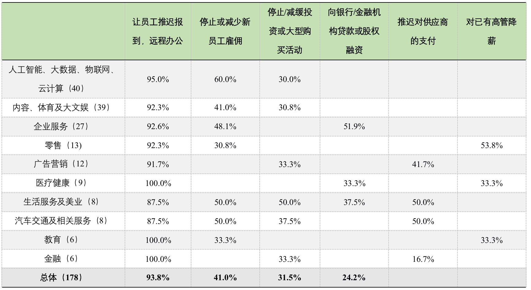 为应对新冠肺炎疫情对公司正常生产经营活动产生的影响,93.8%参与调查的创业者选择让员工推迟报到,远程办公。创业公司还采取不同方式开源节流。其中,停止或减少新员工雇佣、停止或减缓投资及大型购买活动、向银行或金融机构贷款或股权融资位居前三,分别得分是41.0%,31.5%和24.2%(图6)。此外,23.0%的创业公司选择对已有高管降薪,比例高于选择对已有普通员工降薪(11.8%)。18.5%的创业公司将进行裁员。仅有8.4%的创业公司选择从0开始布局线上业务新模式。划分行业来看(表3),受供应商无法提供服务影响严重、或存在明显现金流压力的行业(广告营销、生活服务及美业、汽车交通及相关服务等)还采取了推迟对供应商付款的措施。零售、医疗健康和教育行业的创业公司则更多地选择对已有高管降薪来节省支出、缓解现金流压力。