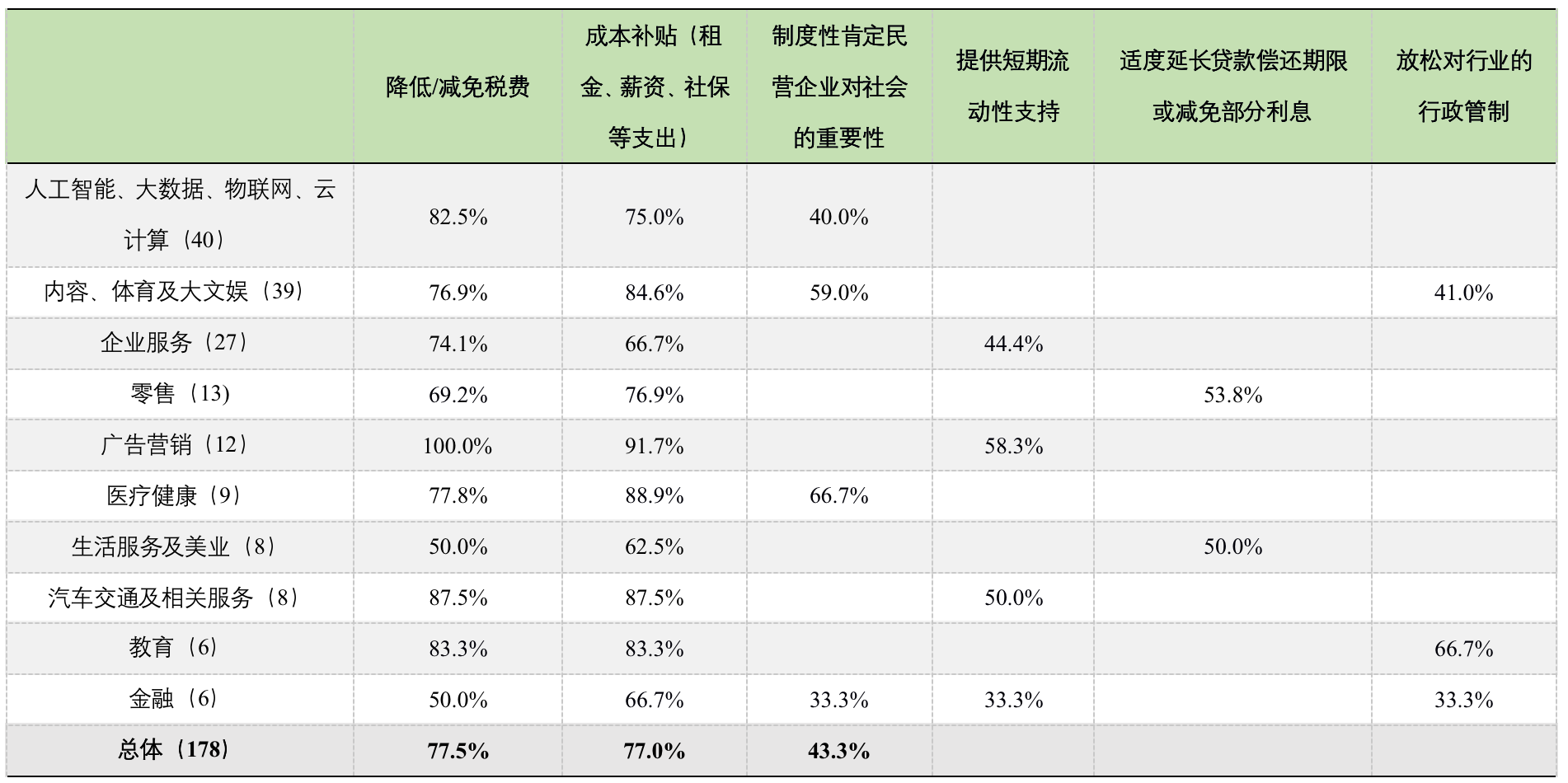 表4 分行业企业对政府举措的主要诉求(数值为公司数量占比)