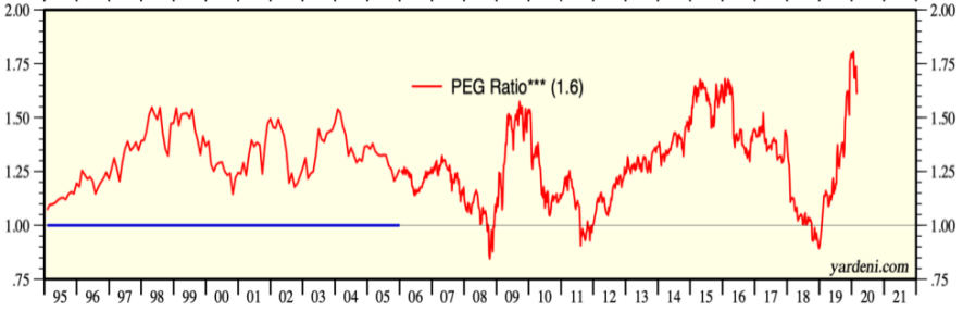 图表3是1995年初至2020年3月11日每周标普500指数PEG值,其中每股盈利增长率采用的是市场对每股盈利未来5年增长率的一致预期。PEG的最新值是3月11日的1.6,稍低于2020年2月底的最高值1.8。