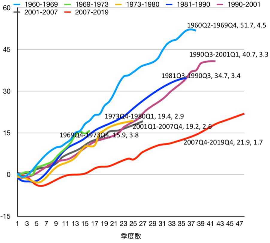 虽然2007-2019整个周期的持续时间最长,但它的累积增长率只比其它三个短周期的稍高,比如1973-1980周期只有26个季度,累积增长率是19.4%,而2007-2019周期(截止到2019年4季度)已经持续了48个季度,累计增长率只有21.9%,远低于1960-1969周期的51.7%。而它的年均增长率是7个周期中最低的,只有1.7%,远低于1960-1969周期的4.5%,也低于上一个周期的2.6%。
