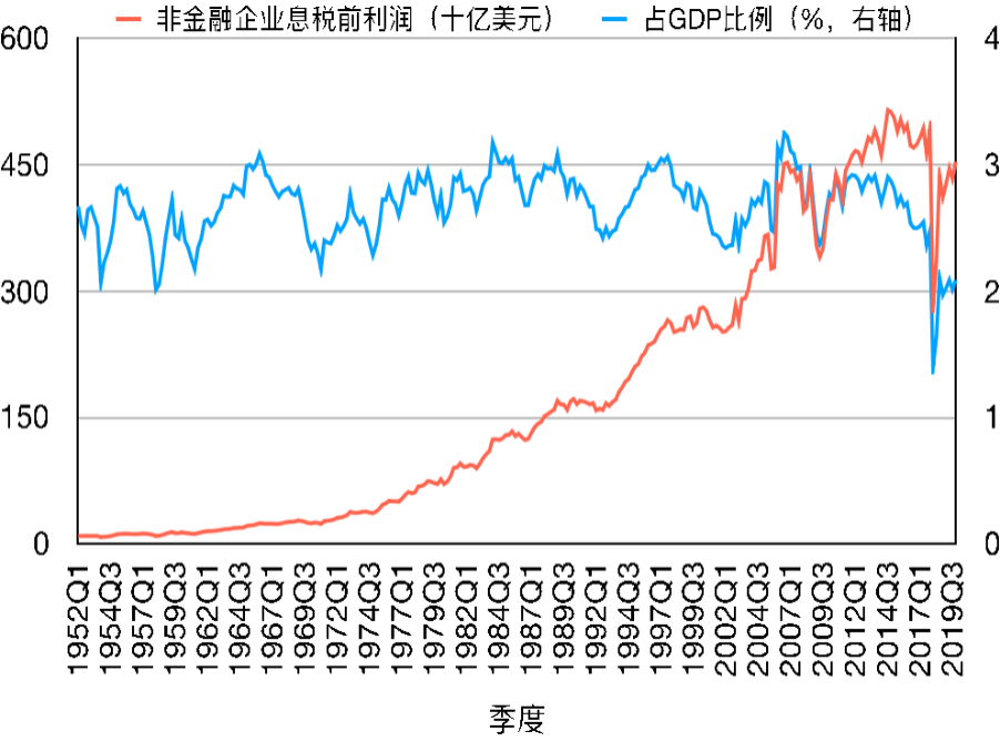 非金融企业的利税前利润最大值是2014年3季度的5153亿美元,此后则开始下降,2018年1季度曾下降至2837亿美元,在2019年底则是4542亿美元、与次贷危机前2006年3季度的值相当。
