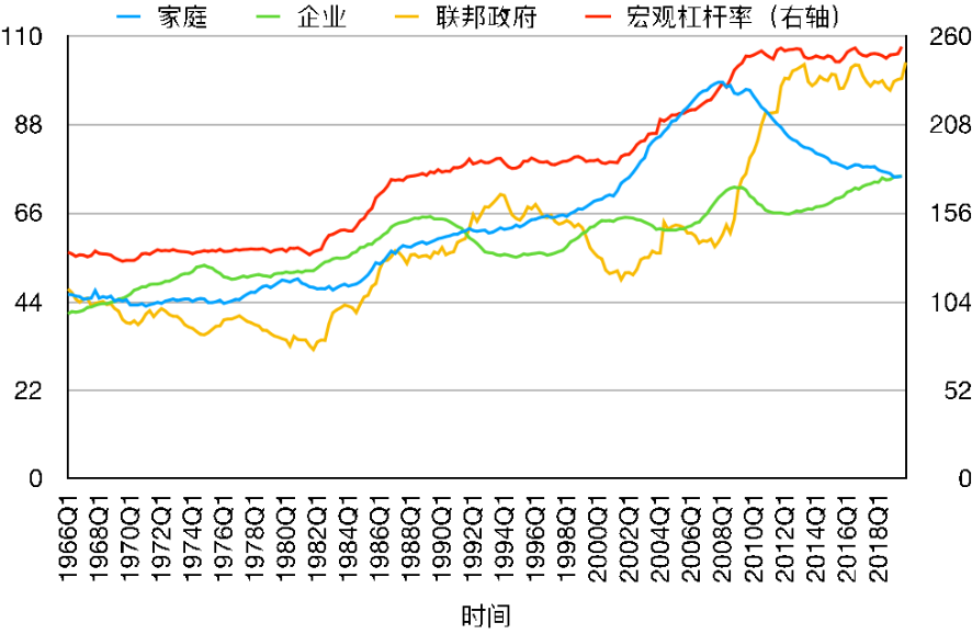 美国的宏观杠杆率也是在不断上升的,从1966年1季度的133%上升至2019年3季度的254%。企业部门的杠杆率虽有起伏,但总体趋势是在上升的,从1966年初的41%上升至2019年3季度的75%。而居民部门的杠杆率则经历了一个先上升后下降的过程,从1966年初的46%上升至2007年底的99%,此后则一路下降至2019年3季度的75%。