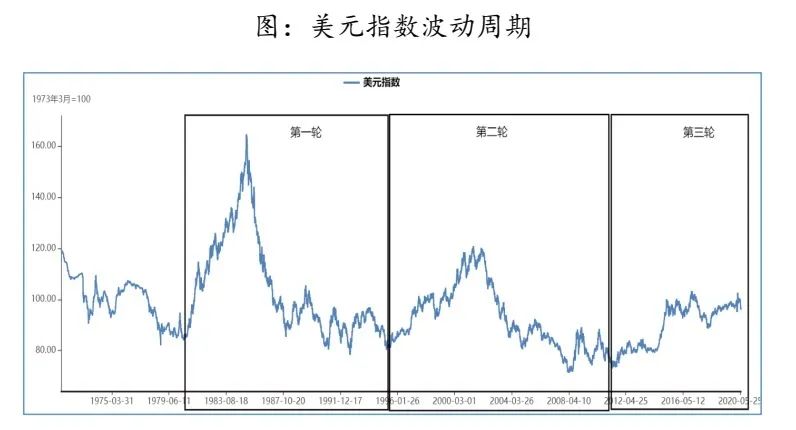 1973 年布雷顿森林体系破灭以来,欧美协商建立牙买加体系,一是实行浮动汇率制,二是黄金非货币化,此后全球进入纯信用货币时代,美元凭借其无锚的世界货币地位在全球输出,造成美国大量外债,同时也造成了美元的周期波动。