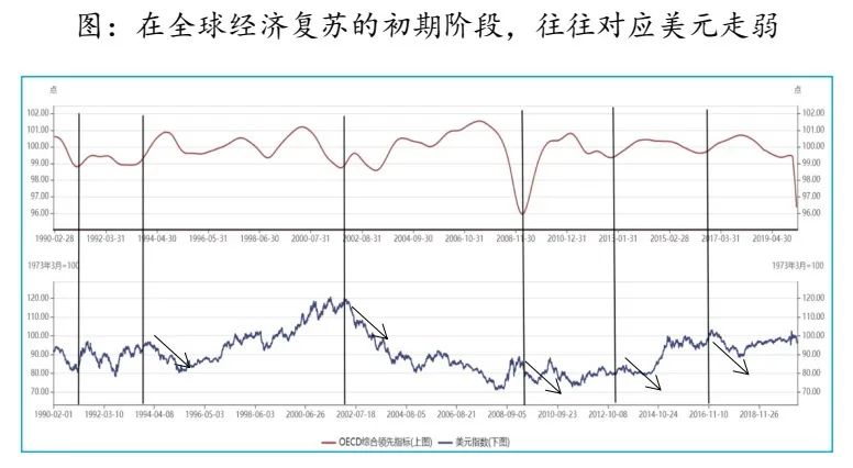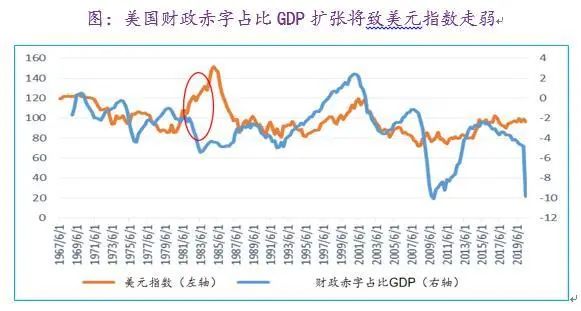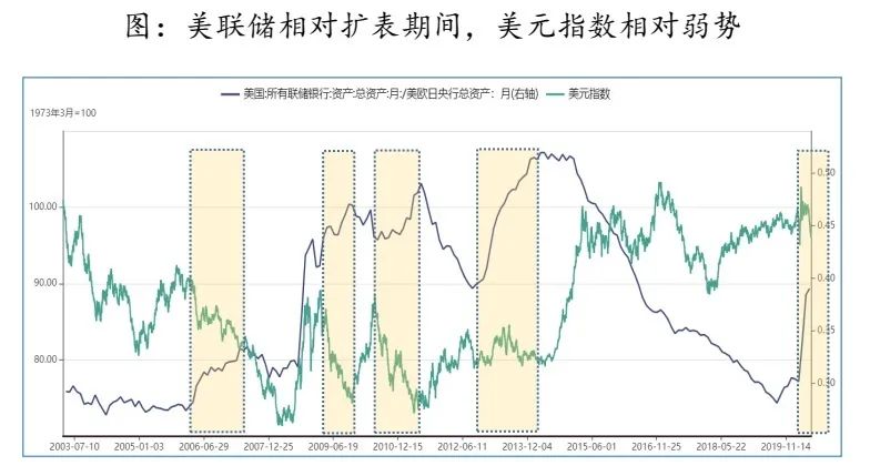 当前情况下,美联储预期在2022年之前会维持0%-0.25%的联邦基金利率区间,同时美联储资产负债表大幅扩张,伴随财政赤字放宽——类似2008-2009年,货币宽松与财政赤字扩张将带动美元步入下调周期。