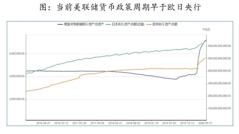 2020年3月23日美联储开启无限量QE之后,美联储货币政策扩张又开始领先于欧洲央行,体现在资产美联储资产扩张速度强于欧日央行,将引发美元走弱。