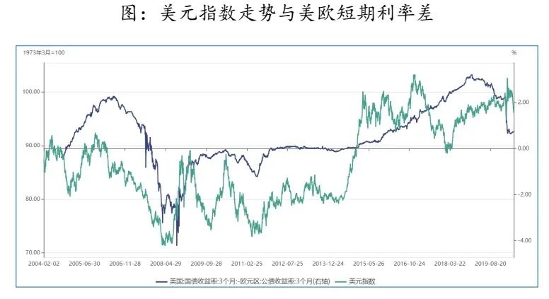 美联储货币政策传导到短期利率走势上,美欧短期利率差下行,将引发美元指数走弱。美元指数走势一般会领先于美欧短期利差拐点,因为美欧短期利差反映的是货币政策预期,而美元指数会先行反映这样的预期。