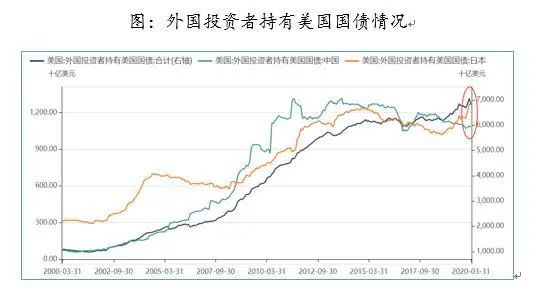 美国财政部公布的截至2020年3月份外国投资者持有美国国债6.8万亿美元,较上月环比下降2566亿美元,创2000年来最大环比降幅,其中中国持有1.08万亿美元,环比下降107亿美元,日本持有1.27亿美元,环比增加34亿美元。