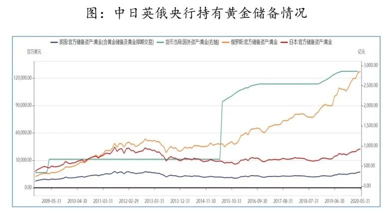 除了减持美债以外,各国央行开始增加黄金购买。中日英俄央行从2018年底开始都在逐渐增持黄金,截至2020年5月份,英国央行储备黄金173亿美元,俄罗斯央行储备黄金1276亿美元,日本央行储备黄金425亿美元,中国央行截至4月份储备黄金2856亿元,约408亿美元。