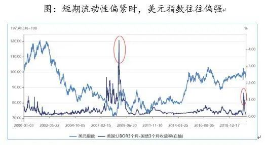 2000年来,Ted利差出现过几次大幅上行:2008年金融危机和2012年欧债危机时,恐慌情绪导致离岸市场流动性收紧;2016年,美国货币基金改革导致美元流动性收紧;2018年以来,美联储加息缩表、美元升值,跨国公司海外利润减税带来美元回流,利差两次上行。