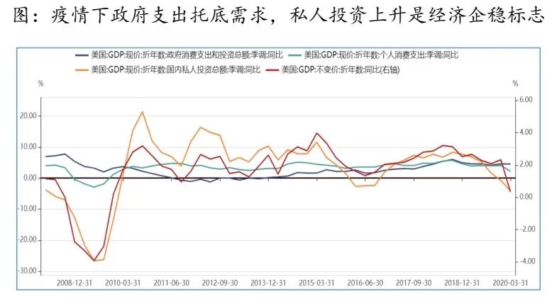 在当前疫情下政府支出托底需求,私人投资上升才是经济企稳标志。