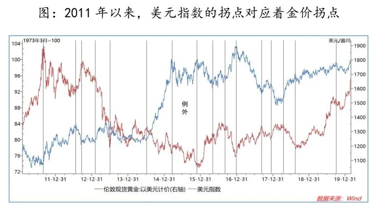 从历史来看,美元指数拐点都对应着黄金价格拐点,虽然两者波动幅度不一致。