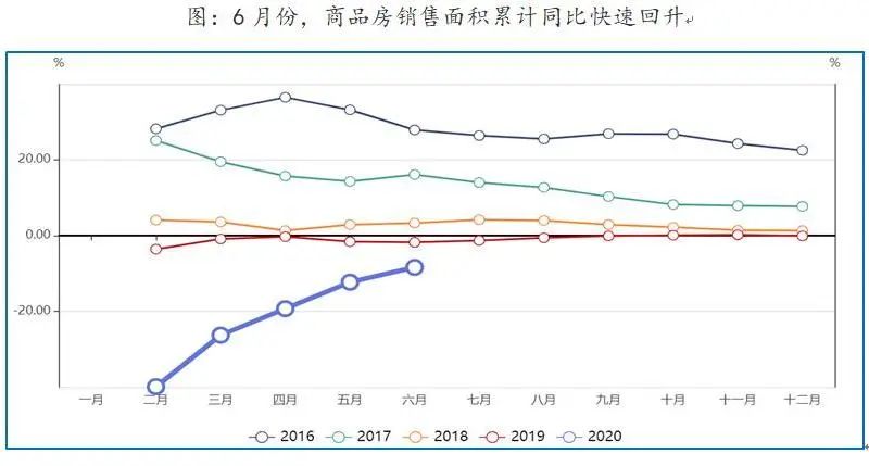 2020年6月份商品房销售面积累计同比-8.4%,较上月回升3.9个百分点,房地产开发投资完成额累计同比增速1.9%,较上月回升2.2个百分点。