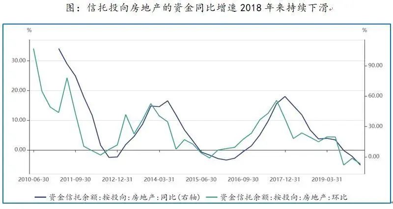 房地产表外融资依然在萎缩,资金信托投向房地产的资金增速持续下滑。
