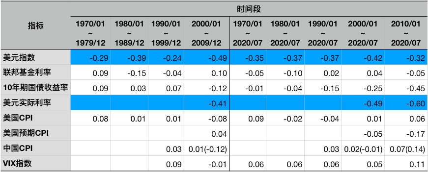 图表2:伦敦黄金现货价格与不同指标的相关系数