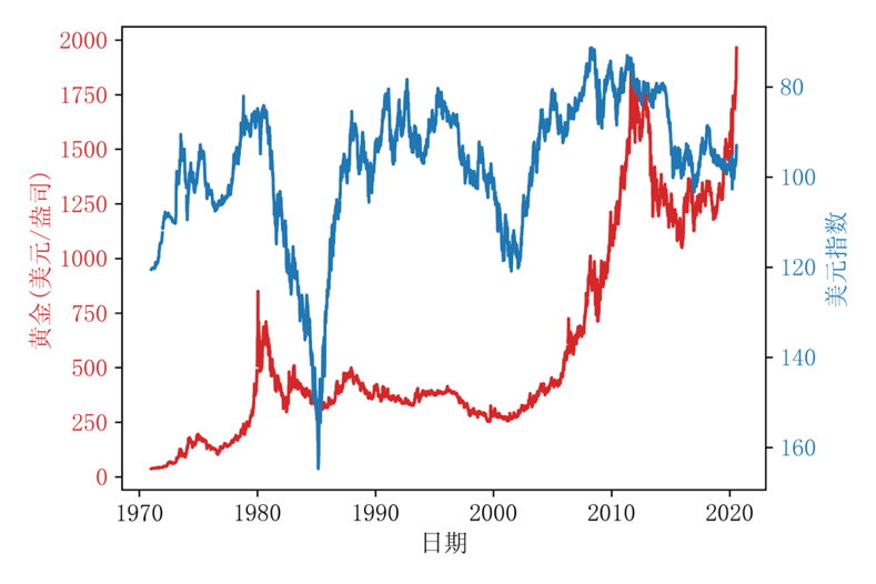 图表3:伦敦现货黄金价格与美元指数的走势(1970年1月至2020年7月)