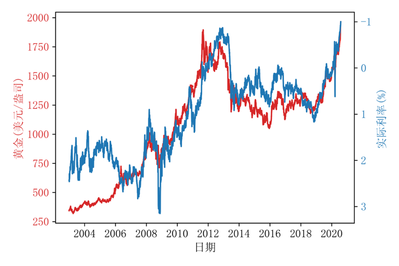 图表4:伦敦黄金现货价格与美元实际利率的走势(2003年1月至2020年7月)