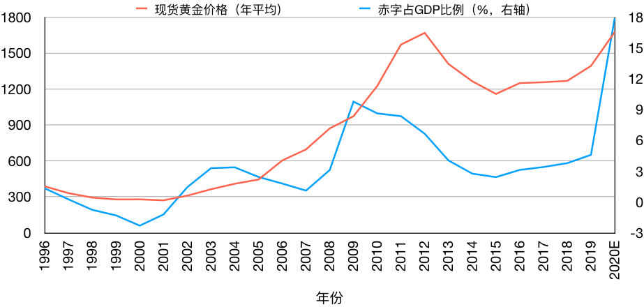 图表5:现货黄金价格和美国联邦政府财政赤字(或盈余)占GDP比例(1996至2020年)