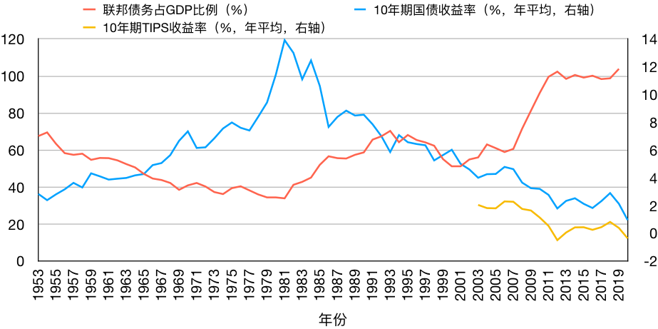 图表6:美国政府杠杆率、10年期国债收益率和10年期TIPS收益率(1953-2020)