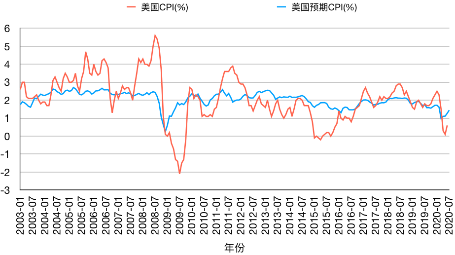 图表7:美国CPI和预期CPI(2003年1月至2020年7月)