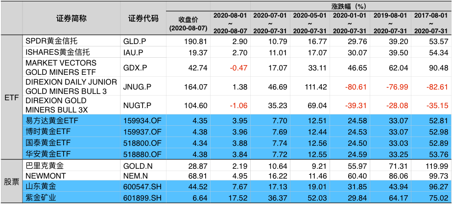 国内的易方达等黄金ETF的跟踪对象是上海黄金交易所的Au99.99品种现货黄金价格,而Au99.99金价是以人民币计价的,由于美元兑人民汇率的波动,Au99.99金价的走势和以美元计价的现货黄金和COMEX金的走势会稍有不同。但长期来看,国内黄金ETF的市场表现和伦敦现货黄金的保持一致,而黄金矿业公司,比如山东黄金和紫金矿业,它们近期的市场表现要优于现货黄金。