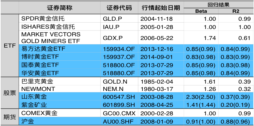 图表9:黄金ETF、矿业行业ETF与矿业公司股票价格变化对现货黄金价格变化的回归结果