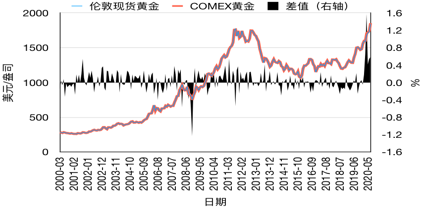 图表10:COMEX黄金与伦敦现货黄金价格的走势(2002年3月至2020年7月)