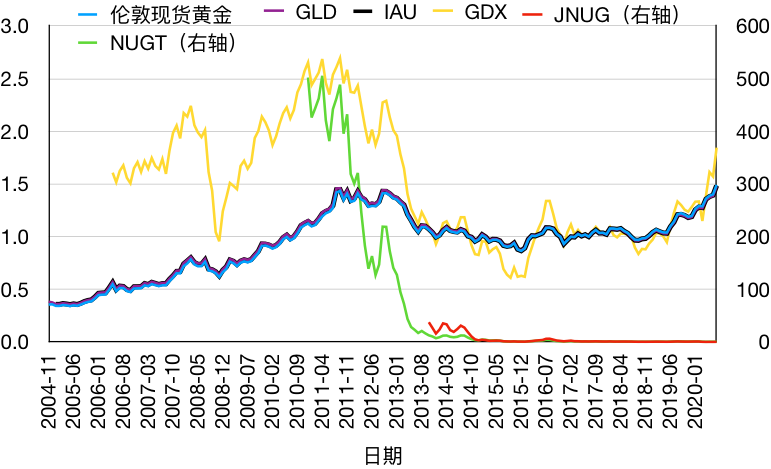 黄金ETF能很好地跟踪黄金价格的变化,而黄金矿业公司股价的变化幅度要大于黄金自身价格的变化幅度,因而当黄金价格连续上涨时,这些公司股票的价格上涨幅度更大。而自带杠杆的矿业行业ETF放大了这个涨幅,因而在短期内它们的上涨幅度不但大于黄金,也大于黄金矿业公司股票,但在中长期来看,自带杠杆ETF的收益很有可能是负的、不是个好的投资品种。