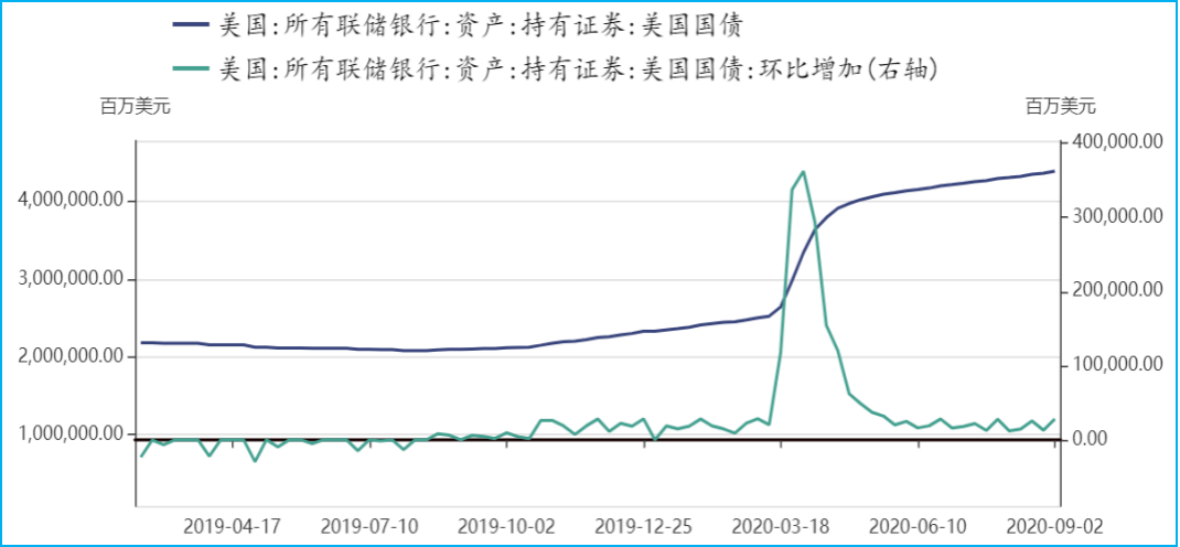 当前美联储购债规模维持在稳定的增速——截至9月2日,美联储持有国债规模4.39万亿美元,近4周增加了810亿美元,比原来预计每月购买1200亿美元国债说法显得略有不足,但这并不成为美联储边际收紧的理由,美联储持续增持国债的趋势还在,而且并没有表示何时退出。