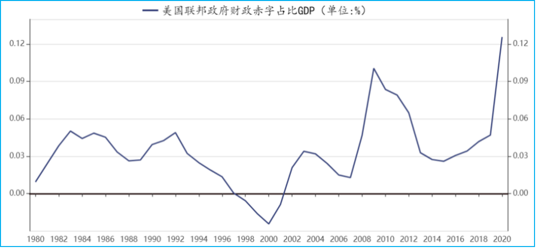 2020年为应对新冠肺炎疫情,美国国会截至8月底通过了四轮救助措施。美国财政赤字因此达到2.45万亿美元,美国联邦政府财政赤字占比2020年折年GDP已经超12.6%,创历史新高,虽然预期美国财政赤字还将创新高,但当前的赤字规模已经让其他国家对美国财政赤字以及国债扩张可持续性形成担忧。