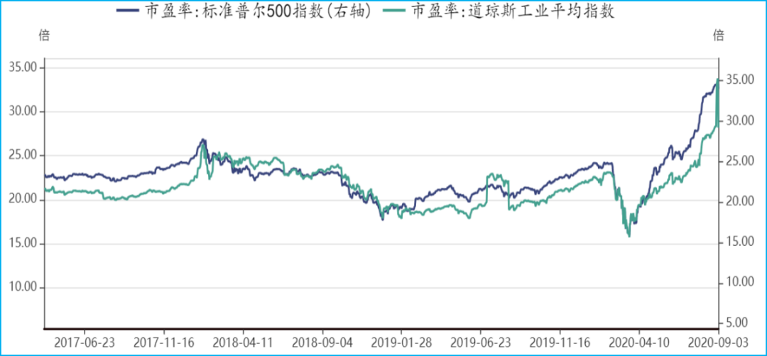 8月份,道琼斯工业平均市盈率为27倍,标普500平均市盈率为33倍,比疫情前2月份的22、24倍大幅上升,当前估值已经超过2000年互联网泡沫时期,而上次估值回落是在2018年底,估值均回到了19倍左右。