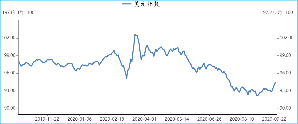 作为大类资产核心,美元指数波动关系到原油、黄金以及人民币走势。2020年三季度,美元指数趋势走弱,带动人民币走强,原油及黄金上涨,虽然美元指数9月份一度反弹重新站上94的阻力位,但我们预期2020年4季度,在美国新一轮财政宽松预期下,美元将维持震荡向下。
