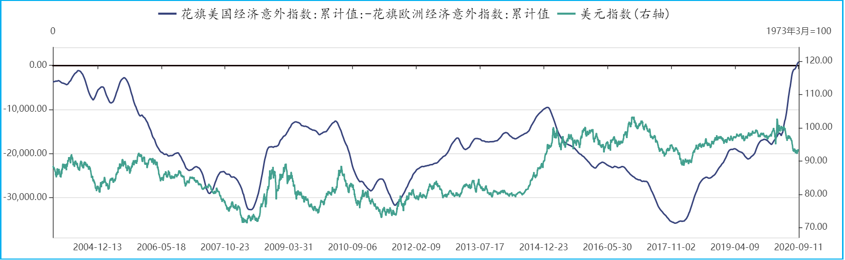 另外,美欧花旗经济意外指数短期也给美元带来上行压力。美欧花旗经济意外指数背后代表美欧经济强弱情况,其差异与美元趋势有着强正相关性。截至2020年10月9日,美欧的花旗经济意外指数累计值差异收于3050,持续上行并处于历史高点。