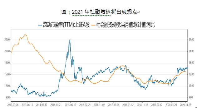 2020年12月18日,中央经济工作会议定调政策为“不急转弯”,这为市场流动性定了一个总基调:1)转弯;2)不急转弯。流动性转弯,我们已经从去年11月社融存量同比增速看出来——随着中国经济在疫情后快速复苏,2021年信贷宽松可能暂告一段落。