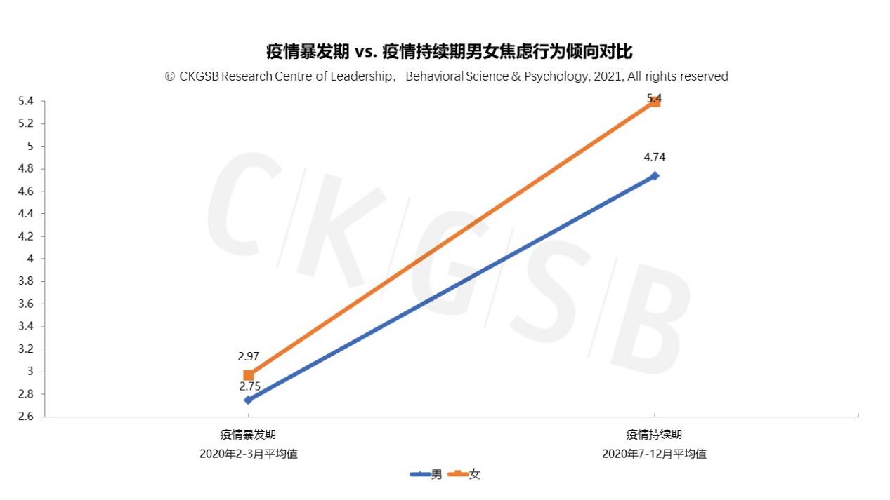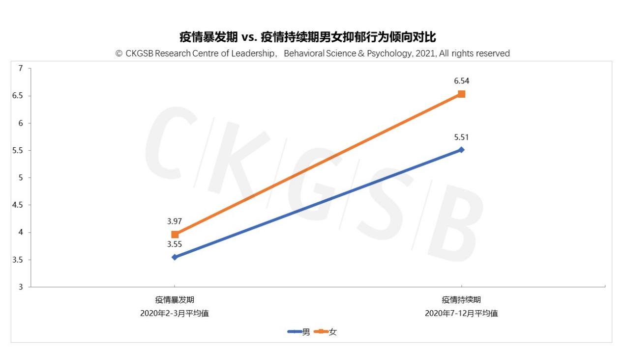 以上分析表明:相比男性受访者,女性受访者在疫情暴发期(2020年2月-3月)承受了更大的收入减少风险,更高的工作强度,呈现出了更高的焦虑和抑郁行为倾向,更低的心理复原力水平。与此同时,两次调研对比分析发现:无论是在疫情暴发期还是持续期,女性一把手和高管在更高的焦虑和抑郁行为倾向下,显示出比同职级男性更高的心理复原力水平。