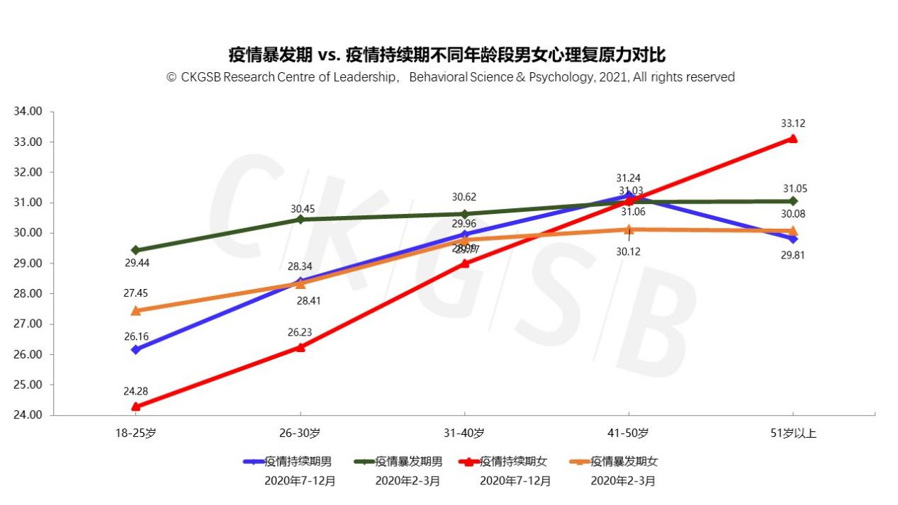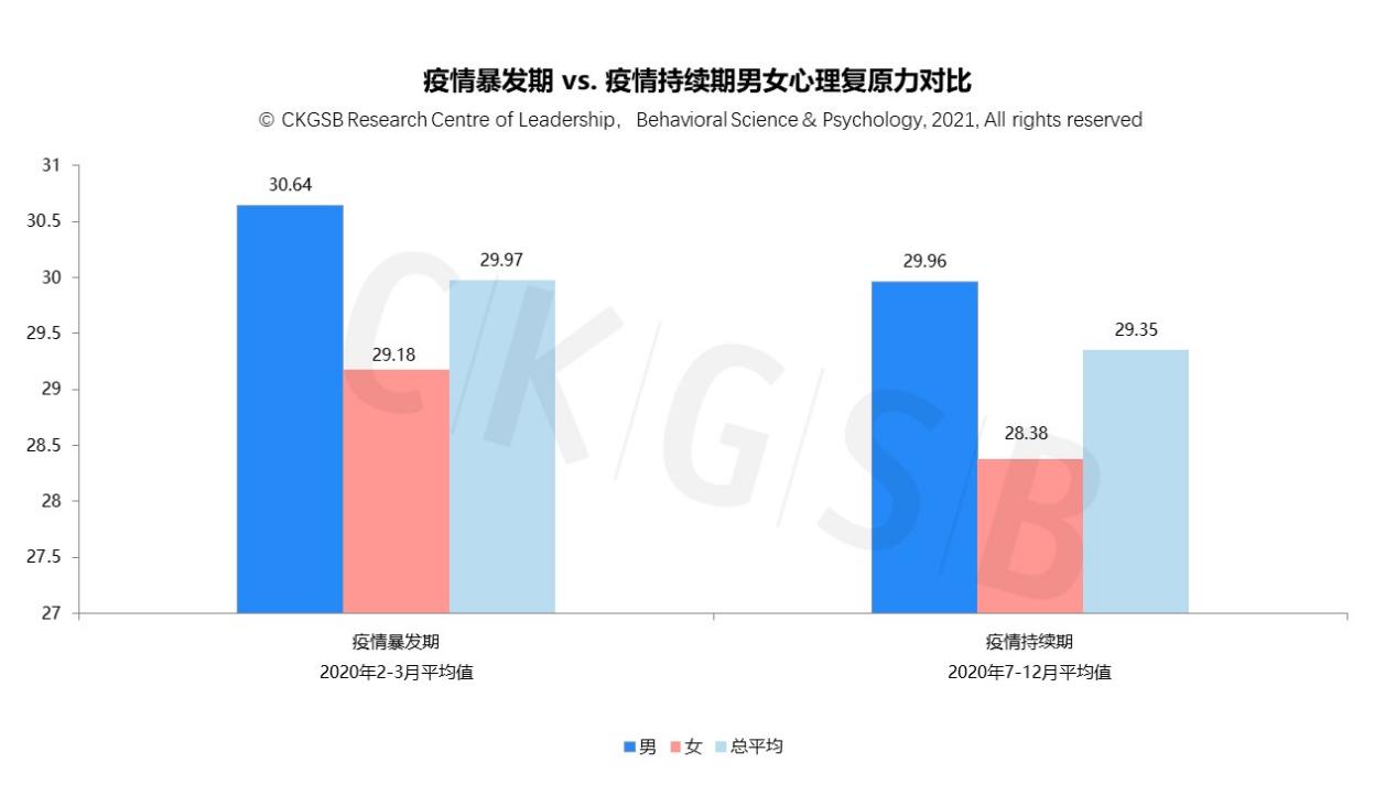从以上两图可见:相对疫情暴发期,疫情持续期男女的焦虑和抑郁行为倾向均大幅上升,女性的焦虑和抑郁行为倾向得分高于男性。同时(见下图)整体心理复原力水平均略微下降(男性:30.64→29.96;女性29.18→28.38)。