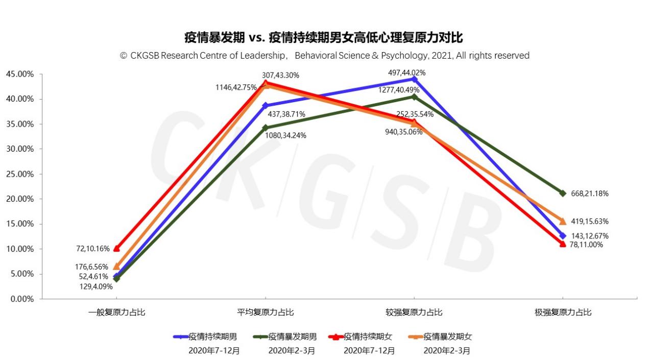 从高低复原力的分布来看,男性和女性整体的极强复原力人群占比均明显下降(男性:21.18%→12.67%;女性:15.63%→11.00%),女性的低复原力人群占比明显上升(6.56%→10.16%)。