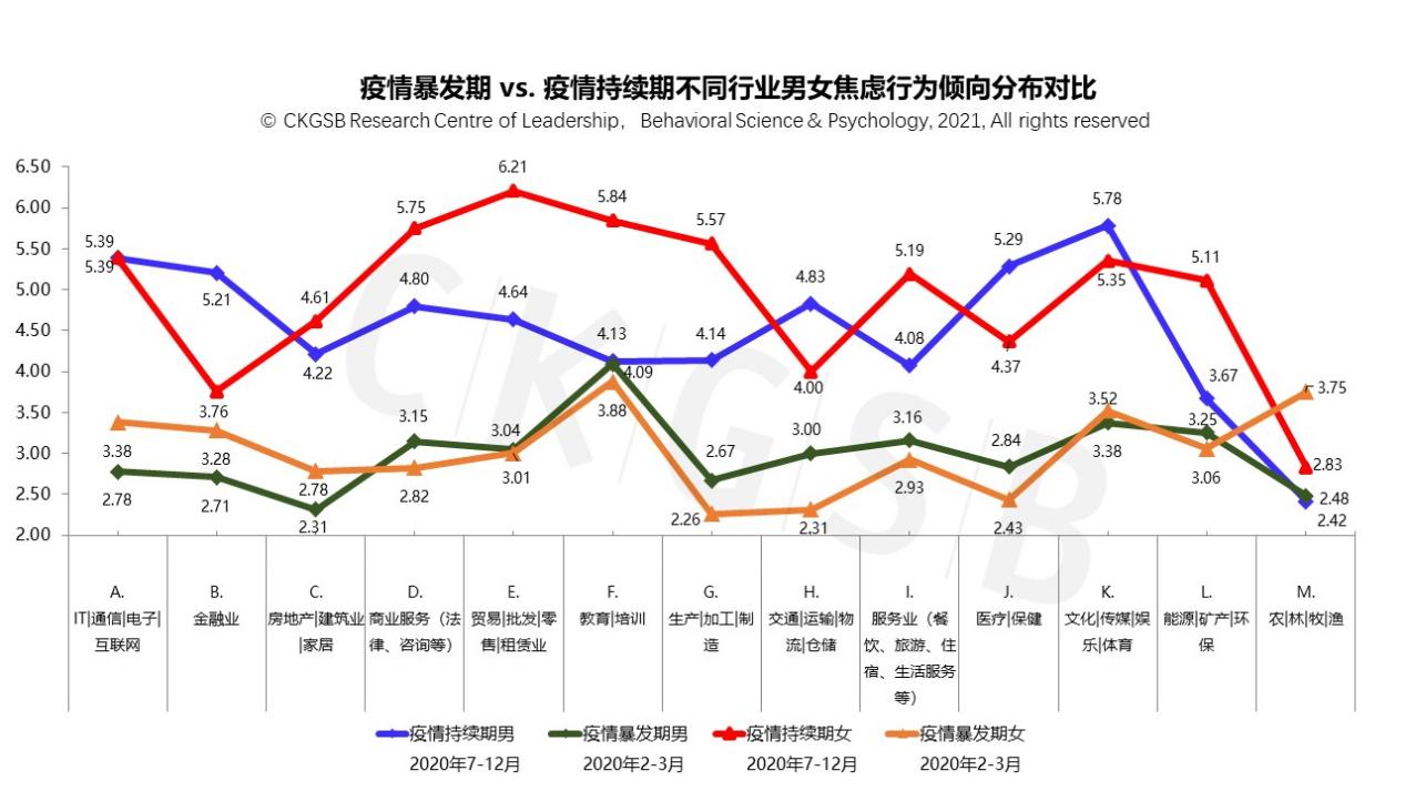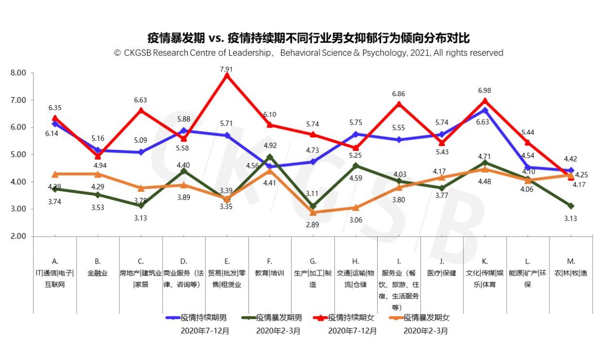 从性别×行业角度来看,在疫情暴发期,男女焦虑行为倾向得分均较高的是教育|培训行业和文化|传媒|娱乐|体育行业,这可能和当时严格的社交隔离对行业的影响相关;而到了疫情持续期,不同行业的男性和女性的焦虑程度有了更大的性别差异,男性焦虑度最高的仍为文化|传媒|娱乐|体育行业(5.78),而女性焦虑度最高的是贸易|批发|零售|租赁业(6.21)。抑郁行为倾向呈现了类似的分布趋势。