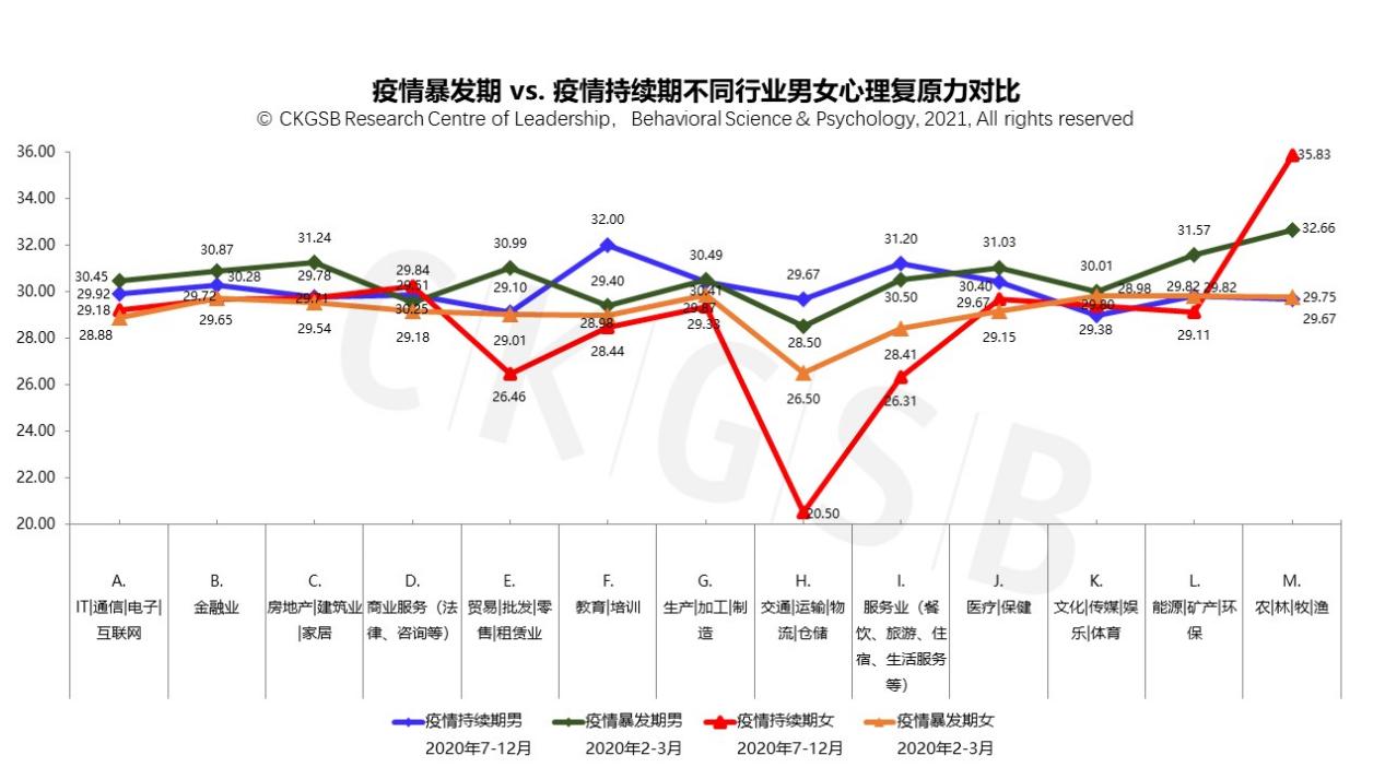从以下心理复原力的分布图中可以看到,疫情持续期各个行业女性的复原力差异显著,同时极值也出现在她们当中:心理复原力得分最高的是农|林|牧|渔行业的女性(35.83),最低的是交通|运输|物流|仓储的女性(20.50)。男性心理复原力最高的是疫情持续期的教育|培训行业男性(32.00),最低的为疫情暴发期的交通|运输|物流|仓储行业男性(28.50)