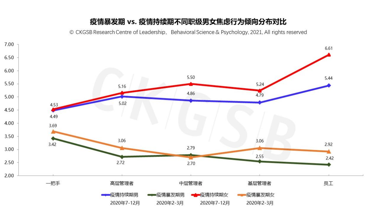 从性别×职级角度,除疫情暴发期的中层管理者之外,各职级女性的焦虑行为倾向得分均高于同职级男性。