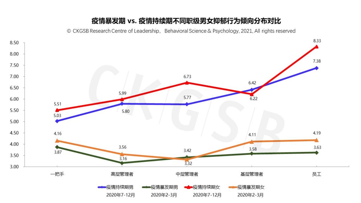 除疫情暴发期的中层管理者和疫情持续期的基层管理者之外,各职级女性的抑郁行为倾向得分均高于同职级男性。