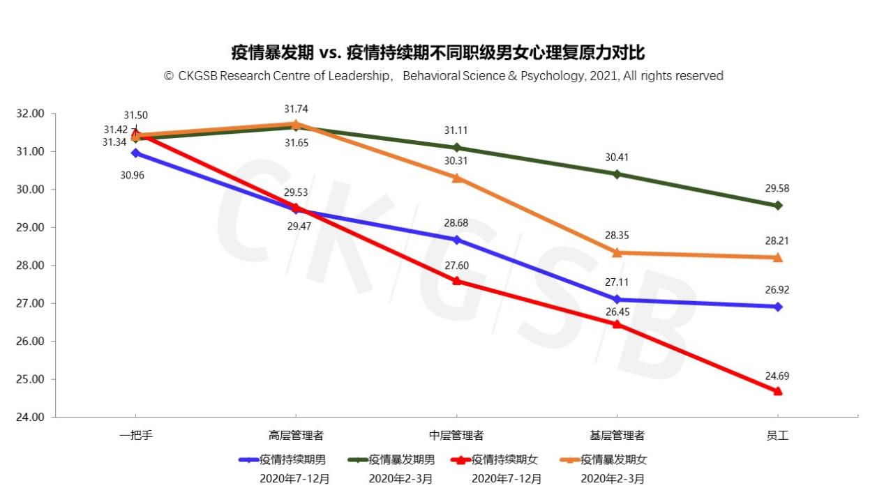 心理复原力得分的性别×职级分布,两次调研有着惊人的一致性:女性一把手和高管的心理复原力得分均高于同职级男性。