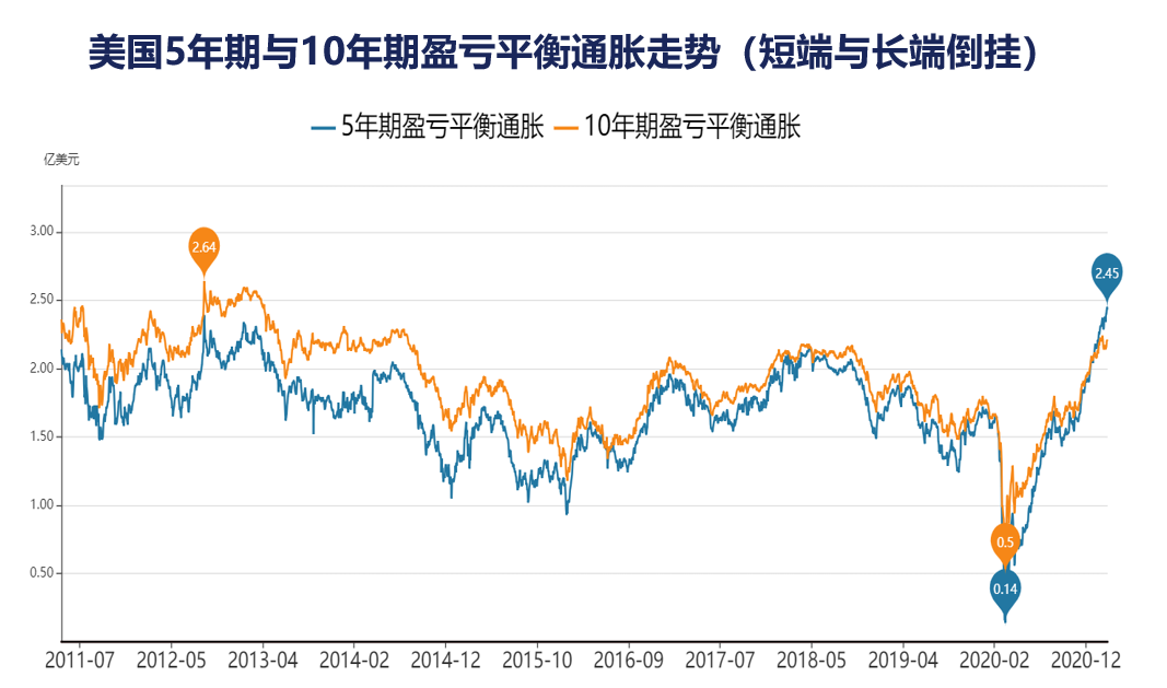 但随着经济的恢复,通胀的预期也开始反弹。通过美国这种与通胀挂钩的国债,可以推算出市场对未来通胀增长的预期,可以看到预期在不断上行。